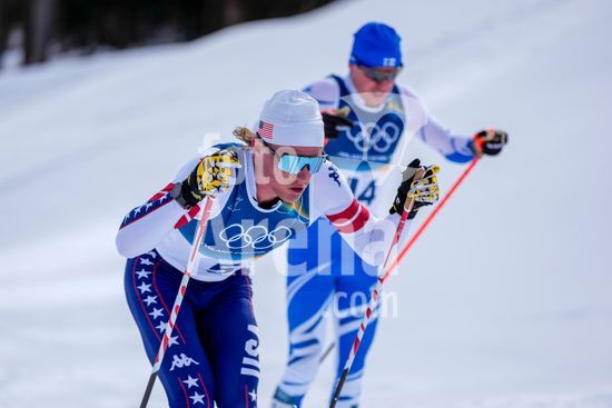 ny210226122011 Gus Schumacher (5), of the United States, during the 50km mass start cross-country skiing men's competition at the 2026 Milan Cortina Winter Olympics in Lago, Italy, Saturday, Feb. 21, 2026. (Vincent Alban/The New York Times/Fotoarena)