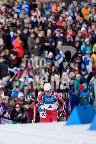 ny210226121311 Martin Loewstroem Nyenget (3) and Johannes Hoesflot Klaebo (1), during the 50km mass start cross-country skiing men's competition at the 2026 Milan Cortina Winter Olympics in Lago, Italy, Saturday, Feb. 21, 2026. (Vincent Alban/The New York Times/Fotoarena)