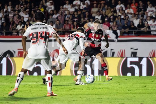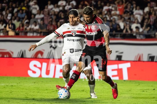 2875497 Alan Franco (São Paulo) e Everton Cebolinha (Flamengo) durante a partida entre São Paulo e Flamengo, válida pela 1ª rodada do Brasileirão 2026, realizada na noite desta quarta-feira (28) no MorumBIS em São Paulo, SP.