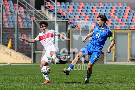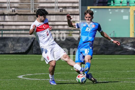 2912312 Patrik Baleja (17 Eslovaquia) e Omer Arda Kara (5 Turquia) durante a partida da Fase de Elite do Campeonato Europeu Sub-19 da UEFA de 2026 entre Turquia e Eslovaquia no estadio San Vito-Marulla, Italia. (FRANCESCO FARINA / SPP)