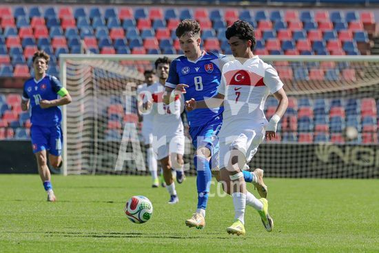 2912318 Marco Bortoli (8 Eslovaquia) e Berkay Aslan (7 Turquia) durante a partida da Fase de Elite do Campeonato Europeu Sub-19 da UEFA de 2026, entre Turquia e Eslovaquia, no estadio San Vito-Marulla, Italia. (FRANCESCO FARINA / SPP)