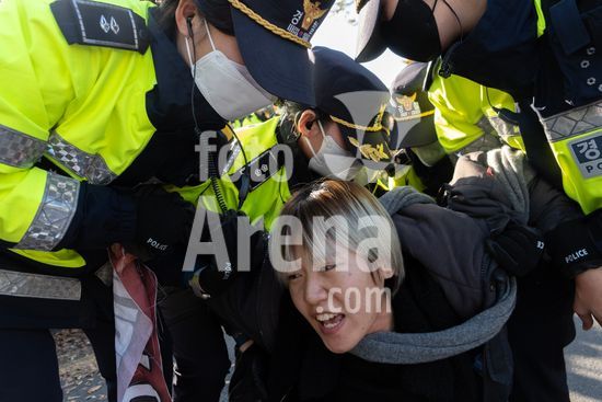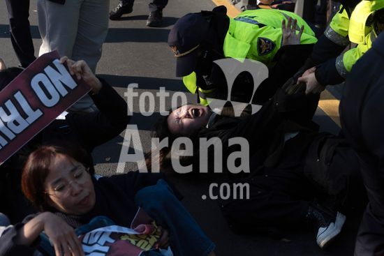 ny291025094413 Protesters are forcefully removed by the police as President Donald Trump and Republic of Korea President Lee Jae-myung meet at the Asia-Pacific Economic Cooperation forum, at the Gyeongju Arts Center in Gyeongju, South Korea, Wednesday, Oct. 29, 2025. (Chang W. Lee/The New York Times/Fotoarena)