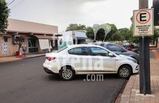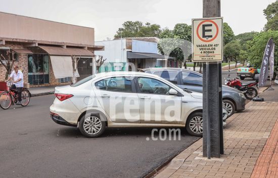 2894220 Veículos estacionados na diagonal conforme placa na rua mostrando vagas em 45°.