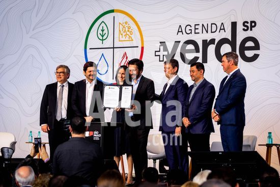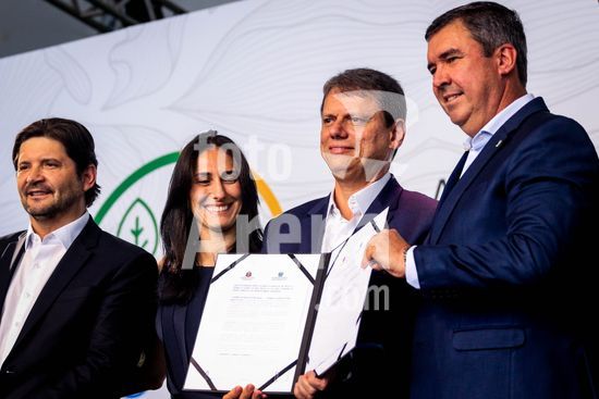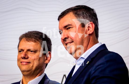 2835472 O governador do Estado de São Paulo, Tarcísio de Freitas, o prefeito da cidade de São Paulo, Ricardo Nunes e o Reitor da Universidade de São Paulo (USP), Carlos Gilberto Carlotti Junior participam da abertura oficial do Summit Agenda Sp+Verde que acontece nesta terça-feira (4) no Parque Villa Lobos na zona oeste da capital paulista. O evento tem como objetivo promover debate sobre desenvolvimento sustentável e economia verde. Na foto, André do Prado, Natalia Resende, Tarcísio de Freitas e Eduardo Riedel durante assinatura de parceria entre os estados de São Paulo e Mato Gtrosso do Sul.
