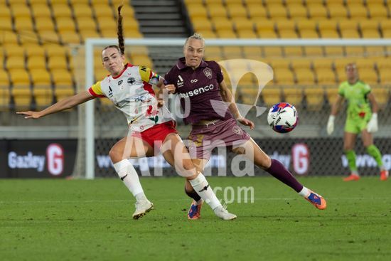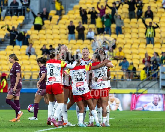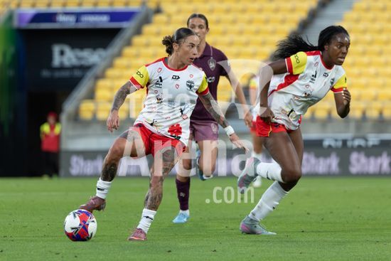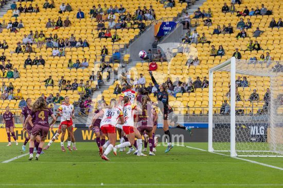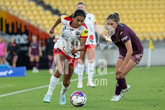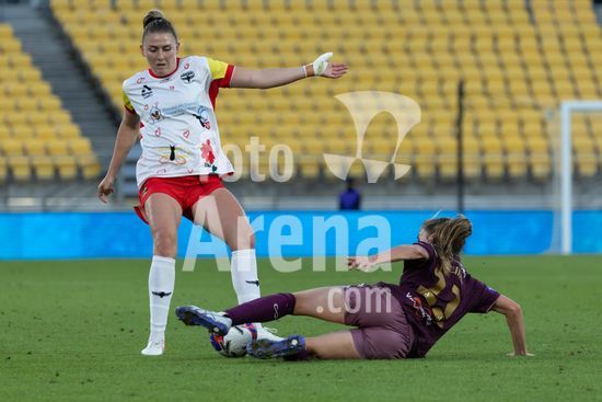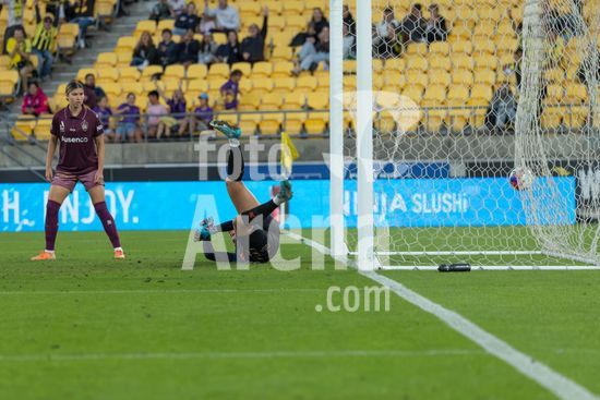 A atacante do Wellington, Manaia Elliot, chuta a gol, passando pela goleira do Brisbane, Tahlia Franco, e marca o primeiro gol da partida. Wellington Phoenix x Brisbane Roar. Ninja A League. 19ª rodada. Estadio Hnry. Wellington. Nova Zelandia. Vitoria do Wellington Phoenix. Placar final: 3 a 0 (intervalo: 2 a 0). Foto de Joe Serci (SPP) na Nova Zelandia. (Joe Serci / SPP)