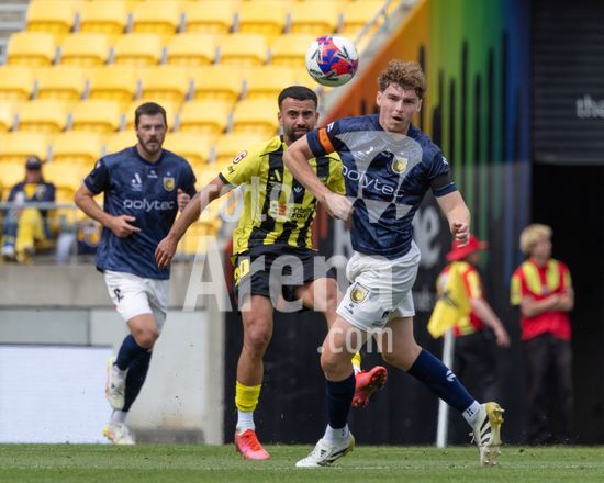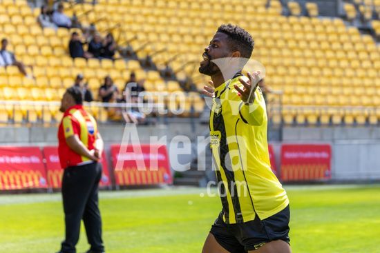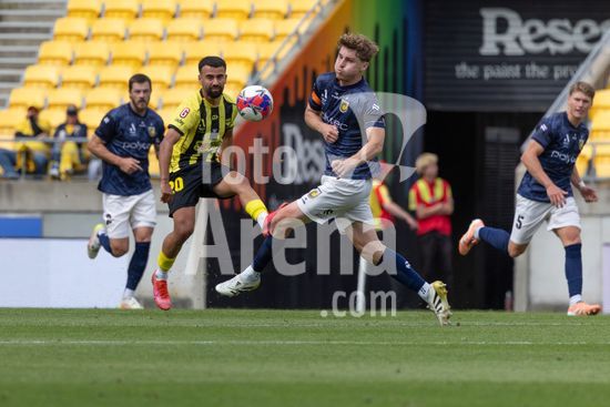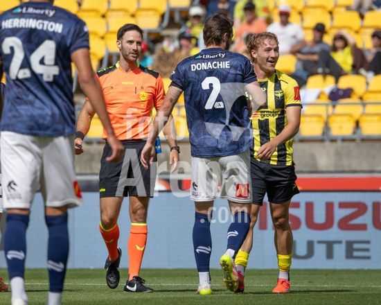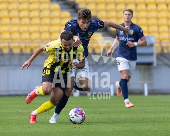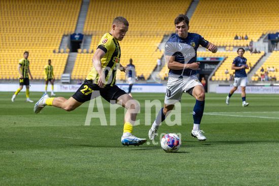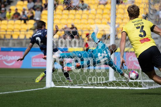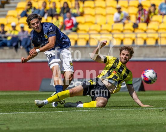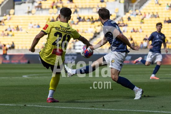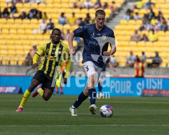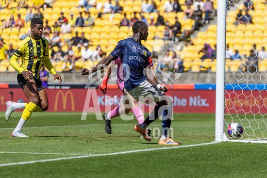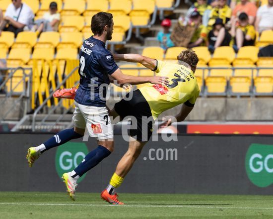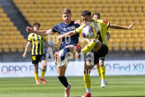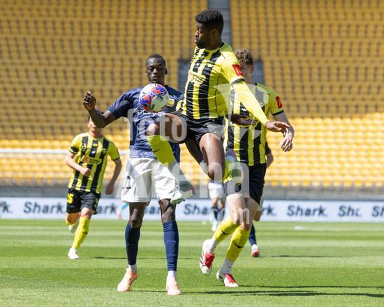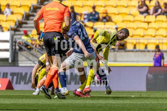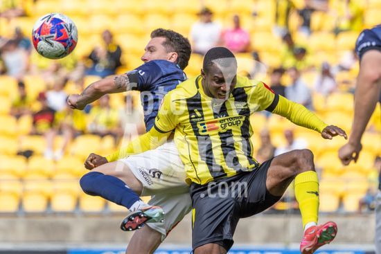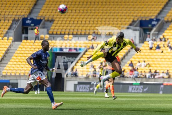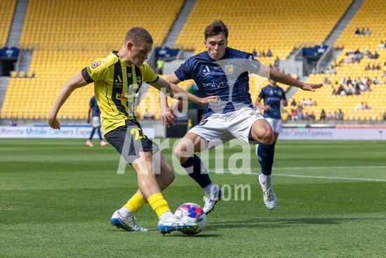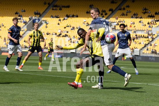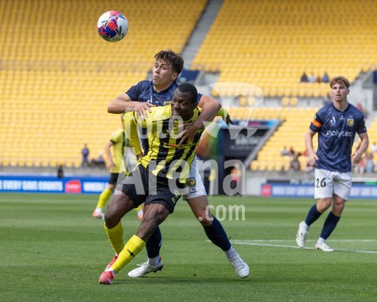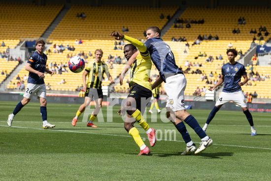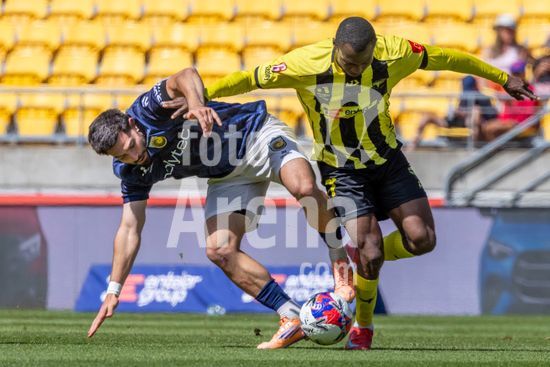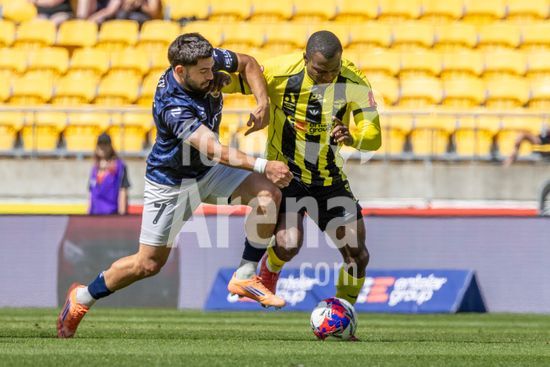 O atacante do Wellington, Ifeanyi Eze, protege a bola da tentativa de desarme do ponta do Central Coast, Christian Theoharous. Wellington Phoenix x Central Coast Mariners. Isuzu Ute A-League, 9ª rodada. Sky Stadium. Wellington. Nova Zelandia. Vitoria do Wellington Phoenix. Placar final: 3 a 1 (intervalo: 1 a 1). (Joe Serci / SPP)