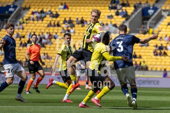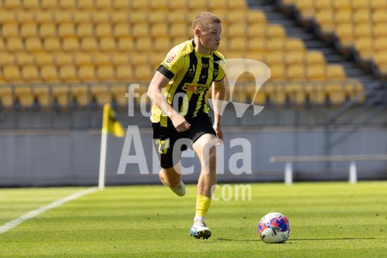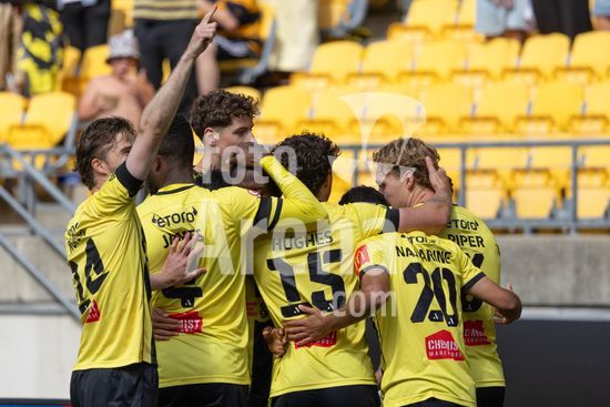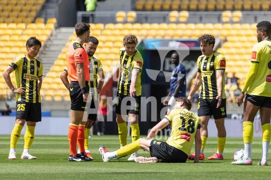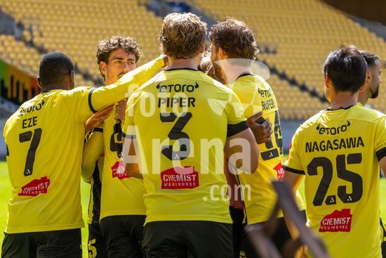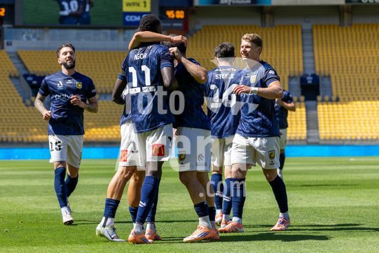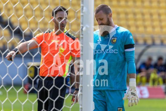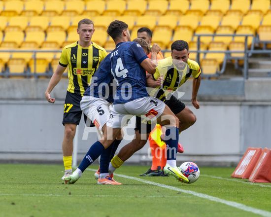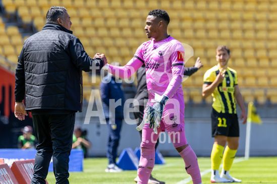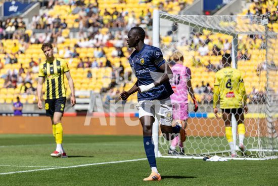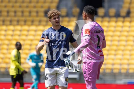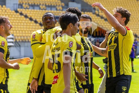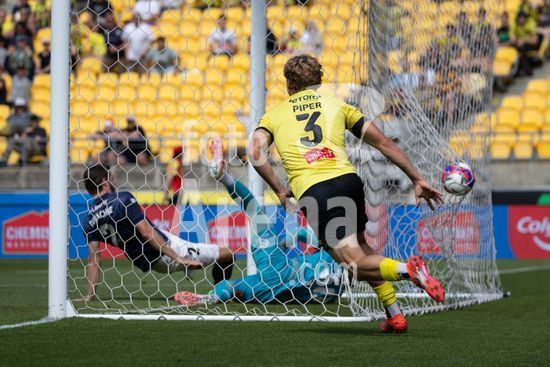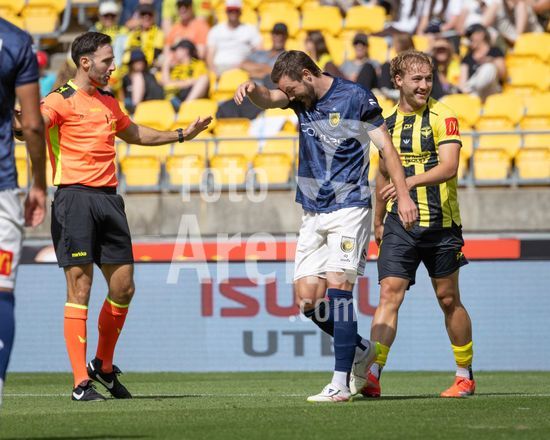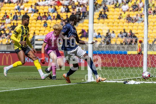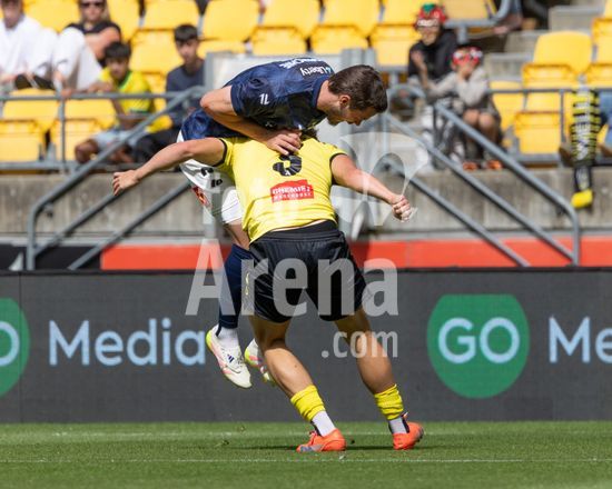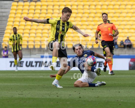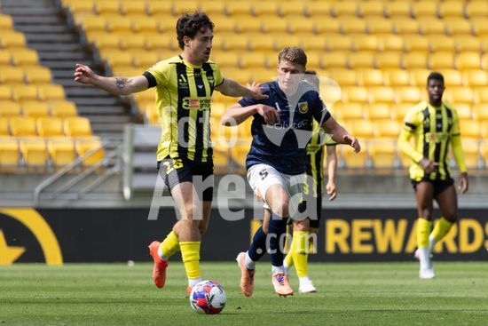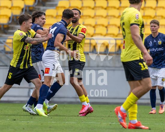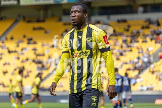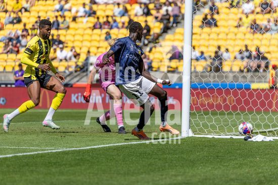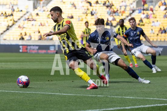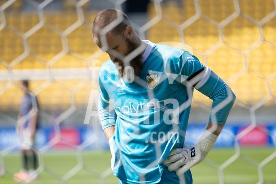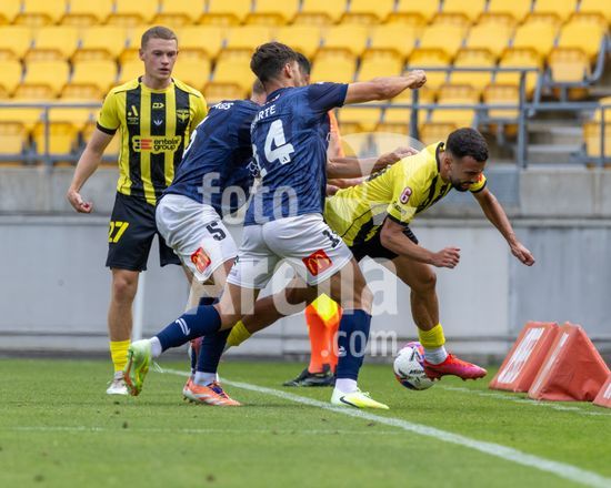 O atacante do Wellington, Ifeanyi Eze, protege a bola da tentativa de desarme do ponta do Central Coast, Christian Theoharous. Wellington Phoenix x Central Coast Mariners. Isuzu Ute A-League, 9ª rodada. Sky Stadium. Wellington. Nova Zelandia. Vitoria do Wellington Phoenix. Placar final: 3 a 1 (intervalo: 1 a 1). (Joe Serci / SPP)