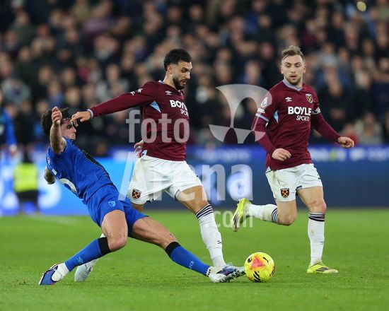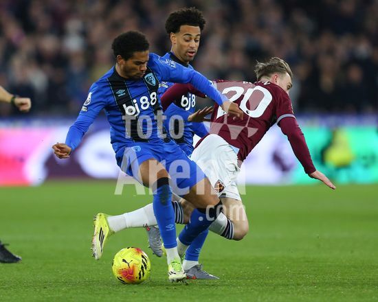 2892334 Londres, Inglaterra, 21 de fevereiro de 2026: Jarrod Bowen (20 West Ham United) desarmado por Amine Adli (21 AFC Bournemouth) durante a partida da Premier League entre West Ham United e AFC Bournemouth no Estadio de Londres, em Londres, Inglaterra. (Foto de Jay Patel/Sports Press Photo/SPP) (Jay Patel/Sports Press Photo/SPP)