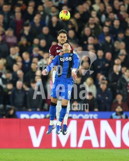 2892302 Londres, Inglaterra, 21 de fevereiro de 2026: Konstantinos Mavropanos (15 West Ham United) e Evanilson (9 AFC Bournemouth) disputam uma bola de cabeca durante a partida da Premier League entre West Ham United e AFC Bournemouth no Estadio de Londres, em Londres, Inglaterra. (Foto de Jay Patel/Sports Press Photo/SPP) (Jay Patel/Sports Press Photo/SPP)