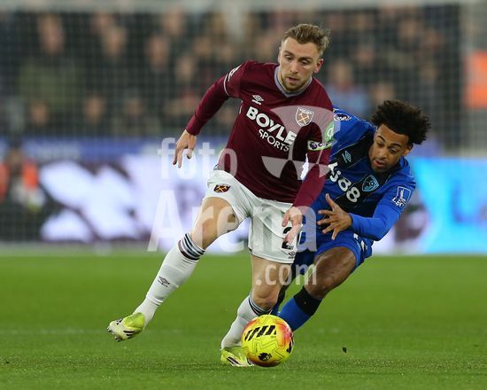 2892308 Londres, Inglaterra, 21 de fevereiro de 2026: Jarrod Bowen (20 West Ham United) dribla Tyler Adams (12 AFC Bournemouth) durante a partida da Premier League entre West Ham United e AFC Bournemouth no Estadio de Londres, em Londres, Inglaterra. (Foto de Jay Patel/Sports Press Photo/SPP) (Jay Patel/Sports Press Photo/SPP)