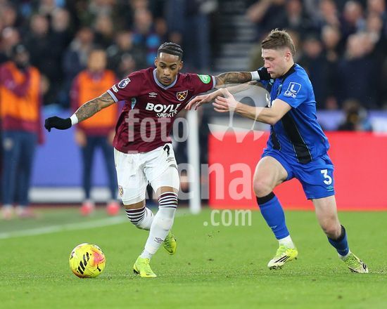2892328 Londres, Inglaterra, 21 de fevereiro de 2026: Mateus Fernandes (18 West Ham United) desarmado por Adrien Truffert (3 AFC Bournemouth) durante a partida da Premier League entre West Ham United e AFC Bournemouth no Estadio de Londres, em Londres, Inglaterra. (Foto de Jay Patel/Sports Press Photo/SPP) (Jay Patel/Sports Press Photo/SPP)
