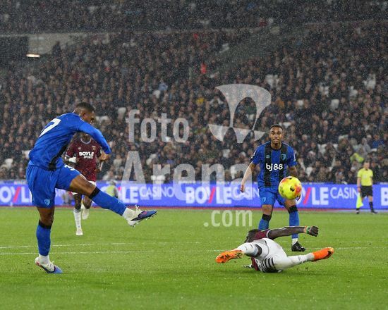 2892348 Londres, Inglaterra, 21 de fevereiro de 2026: Rayan (37 AFC Bournemouth) tem um chute bloqueado por El Hadji Malick Diouf (12 West Ham United) durante a partida da Premier League entre West Ham United e AFC Bournemouth no Estadio de Londres, em Londres, Inglaterra. (Foto de Jay Patel/Sports Press Photo/SPP) (Jay Patel/Sports Press Photo/SPP)