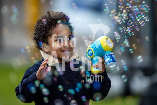 2915037 LONDRES, INGLATERRA - 29 DE MARCO: Uma jovem torcedora do West Ham soprando bolhas de sabao antes da partida da Barclays Women's Super League entre West Ham United e London City Lionesses no Chigwell Construction Stadium em 29 de marco de 2026 em Londres, Inglaterra. (Mike Turner/SPP)