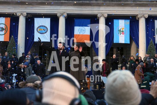 ny010126180211 Mayor Zohran Mamdani and his wife, Rama Duwaji, wave at the end of the public inauguration ceremony at City Hall in New York on Thursday, Jan. 1, 2026. Mamdani, the cityÕs first Muslim and South Asian mayor, championed immigrants, optimism and the city itself in his inaugural address. (Hiroko Masuike/The New York Times/Fotoarena)