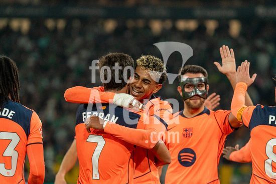 2854817 Lamine Yamal (N10) comemora e abraca Ferran Torres (N7) apos marcar um gol durante a partida da La Liga EA Sports entre Real Betis e FC Barcelona no Estadio La Cartuja em 6 de dezembro de 2025, em Sevilha, Espanha. (Andres Lopez Sheridan / SPP)