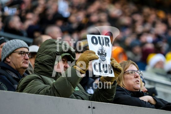 2861403 Torcedores exibem cartazes durante a partida de futebol da Premier League entre Wolverhampton Wanderers e Brentford no estadio Molineux em Wolverhampton, Inglaterra. (Natalie Mincher/SPP)