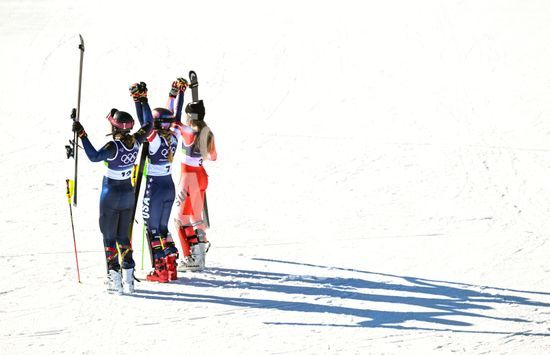 ny180226112011 Anna Swenn Larsson, left, of Sweden, Mikaela Shiffrin, center, of the United States, and Camille Rast, right, of Switzerland, after the second run of the women's slalom competition at the 2026 Milan Cortina Winter Olympics in Cortina d'Ampezzo, Italy, Feb. 18, 2026. (James Hill/The New York Times/Fotoarena)