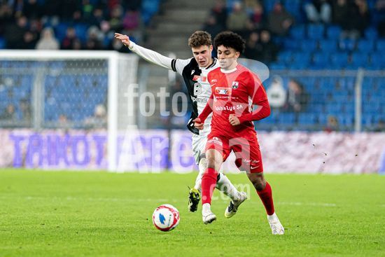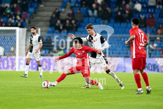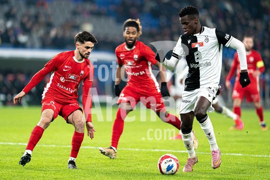 2853400 Abemly Meto Silu Metinho (5 FC Basel 1893), a direita, e Tom Perracino (25 FC Grand-Saconnex), a esquerda, em acao durante a partida das oitavas de final da Copa da Suica entre FC Grand-Saconnex e FC Basel 1893 no St. Jakob-Park, Basileia, Suica. (Priscila Bütler / SPP)