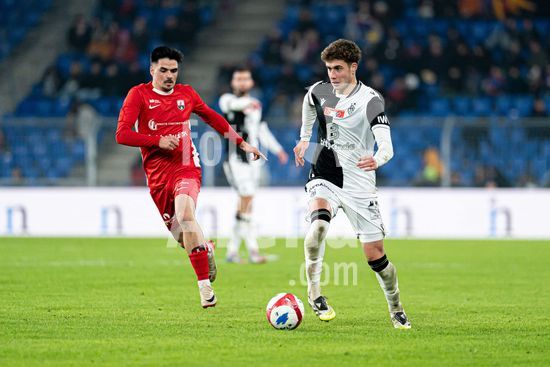 2853404 Andrej Bacanin (14 FC Basel 1893), a direita, e Amin Hajoubi (34 FC Grand-Saconnex), a esquerda, em acao durante a partida das oitavas de final da Copa da Suica entre FC Grand-Saconnex e FC Basel 1893 no St. Jakob-Park, Basileia, Suica. (Priscila Bütler / SPP)