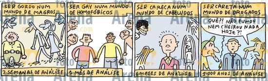 aiaamm4044 ADÃO ITURRUSGARAI, MUNDO MONSTRO, ANOS DE ANÁLISE, FOLHA DE SÃO PAULO, 02.12.2009.DiálogoSer gordo num mundo de magros. 2 semanas de análise.Ser gay num mundo de homofóbicos. 1 mês de análise.Ser careca num mundo de cabeludos. 6 meses de análise.Ser careta num mundo de drogados. 1.000 anos de análise.- Quê?! Não fumou nem cheirou nada hoje?!