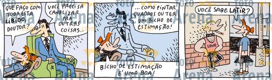 aialmm4000 ADÃO ITURRUSGARAI, MUNDO MONSTRO, ALINE, FOLHA DE SÃO PAULO, 11.10.2009.Diálogo- Que faço com toda esta libido, doutor?- Você precisa canalizar pra outras coisas. Como pintar quadros ou ter um bicho de estimação!- Bicho de estimação é uma boa! Você sabe latir?