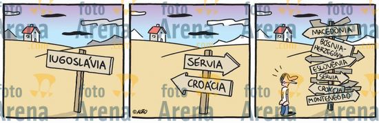 aigeo00001 ADÃO ITURRUSGARAI, GEOPOLÍTICA, FOLHA DE SÃO PAULO, 2000.Sem diálogo.Interpretação: placas indicando a separação da Iugoslávia em diversos países.