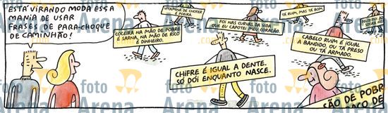 aisoc09016 ADÃO ITURRUSGARAI, MUNDO MONSTRO, 3949, SOCIEDADE, FOLHA DE SÃO PAULO, 12.08.2009.Diálogo- Está virando moda essa mania de usar frases de para-choque de caminhão!Chifre é igual a dente. Só dói enquando nasce.Coceira na mão de pobre é sarna, na mão de rico é dinheiro.Vitamina de chofer é poeira.Foi nas curvas da vida que eu capotei meu coração.Tá ruim, mas tá bom.Cabelo ruim é igual bandido. Ou tá preso ou tá armado.