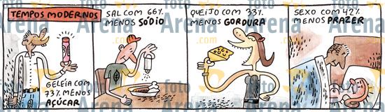 aisoc09017 ADÃO ITURRUSGARAI, MUNDO MONSTRO, 3975, SOCIEDADE, FOLHA DE SÃO PAULO, 11.09.2009.DiálogoTempos modernos.Geléia com 73% menos açúcar.Sal com 66% menos sódio.Queijo com 33% menos gordura.Sexo com 42% menos prazer.