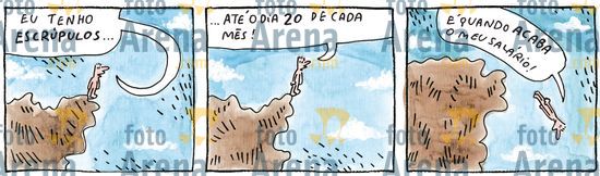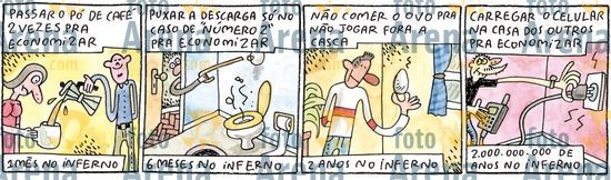 aisoc09026 ADÃO ITURRUSGARAI, MUNDO MONSTRO, 4010, SOCIEDADE, FOLHA DE SÃO PAULO, 22.10.2009.DiálogoPassar o pó do café 2 vezes pra economizar. 1 mês no inferno.Puxar a descarga só no caso de "número 2" pra economizar. 6 meses no inferno.Não comer o ovo pra não jogar fora a casca. 2 anos no inferno.Carregar o celular na casa dos outros pra economizar. 2.000.000.000 de anos no inferno.