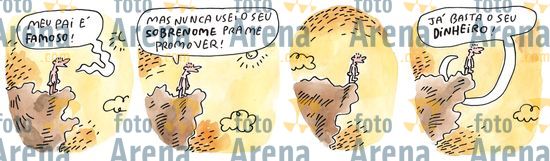 aisoc09023 ADÃO ITURRUSGARAI, MUNDO MONSTRO, 3996, SOCIEDADE, FOLHA DE SÃO PAULO, 06.10.2009.Diálogo- Meu pai é famoso! Mas nunca usei o seu sobrenome pra me promover! Já basta o seu dinheiro!