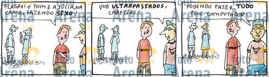 aisoc09024 ADÃO ITURRUSGARAI, MUNDO MONSTRO, 4003, SOCIEDADE, FOLHA DE SÃO PAULO, 14.10.2009.Diálogo- Flagrei o Tom e a Júlia, na cama, fazendo sexo!- Que ultrapassados, caretões! Podendo fazer tudo pelo computador!