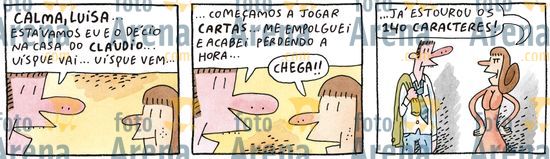 aisoc09025 ADÃO ITURRUSGARAI, MUNDO MONSTRO, 4004, SOCIEDADE, FOLHA DE SÃO PAULO, 15.10.2009.Diálogo- Calma, Luisa... Estávamos eu e o Décio na casa do Cláudio. Uisque vai, uísque vem, começamos a jogar cartas, me empolguei e acabei perdendo a hora...- Chega!! Já estourou os 140 caracteres!