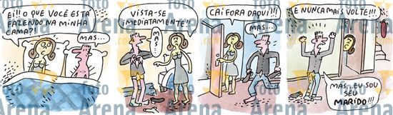 aisoc09028 ADÃO ITURRUSGARAI, MUNDO MONSTRO, 4031, SOCIEDADE, FOLHA DE SÃO PAULO, 17.11.2009.Diálogo- Ei!! O que você está fazendo na minha cama?!- Mas...- Vista-se imediatamente!!- Mas...- Cai fora daqui!!!- Mas...- E nunca mais volte!!!- Mas eu sou seu marido!!!