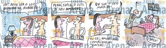 aisoc09029 ADÃO ITURRUSGARAI, MUNDO MONSTRO, 4032, SOCIEDADE, FOLHA DE SÃO PAULO, 18.11.2009.Diálogo- Iih! Deve ser o Luís! Esconda-se, Roberto!- Peraí, Sofia! O Luís é seu amante, eu sou o seu marido!- Eu sei, amor! Não complique as coisas!- Saco!