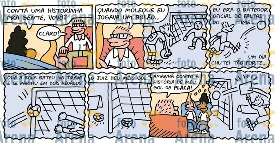 aisoc09032 ADÃO ITURRUSGARAI, SOCIEDADE, FOLHINHA, 2009.Diálogo- Conta uma história pra gente, vovô?- Claro! Quando moleque eu jogava um nolão. Eu era o batedor oficial de faltas do time. Um dia chutei tão forte que a bola bateu na trave e se partiu em dois pedaços! O juiz deu meio gol! Amanhã conto a história de meu gol de placa!