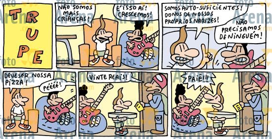 aisoc09033 ADÃO ITURRUSGARAI, SOCIEDADE, FOLHINHA, 2009.DiálogoTrupe.- Não somos mais crianças!- É isso aí! Crescemos!- Somos auto-suficientes! Donos de nossos próprios narizes!- Não precisamos de ninguém!- Deve ser nossa pizza!- Vinte reais!- Paiê!!!