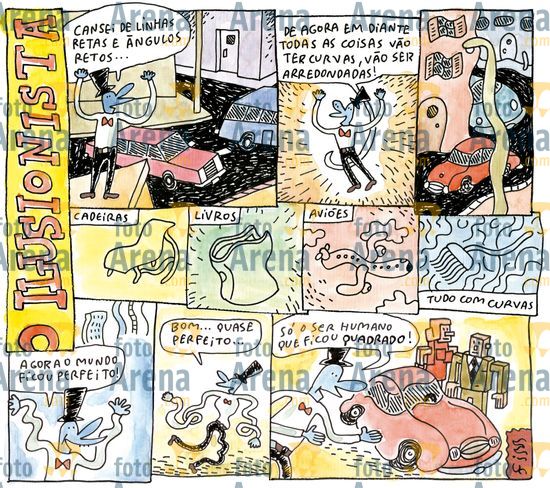 aisoc09034 ADÃO ITURRUSGARAI, SOCIEDADE, FOLHINHA, 2009.DiálogoTrupe.O ilusionista.- Cansei de linhas retas e ângulos retos. De agora em diante todas as coisas vão ter curvas, vão ser arredondadas! Cadeiras. Livros. Aviões. Tudo com curvas. Agora o mundo ficou perfeito! Bom, quase perfeito. Só o ser humano que ficou meio quadrado!