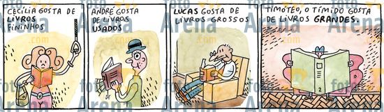 aittmm3999 ADÃO ITURRUSGARAI, MUNDO MONSTRO, TIMÓTEO, O TÍMIDO, FOLHA DE SÃO PAULO, 09.10.2009.DiálogoCecília gosta de livros fininhos.André gosta de livros usados.Lucas gosta de livros grossos.Timóteo, o tímido gosta de livros grandes.