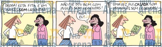 aivari03002 ADÃO ITURRUSGARAI, VARIEDADES, FOLHA DE SÃO PAULO, 2003.Inglês sem legendas.- Droga! Esta fita é em inglês sem legendas!- Não me dou bem com inglês sem legendas!- Nem eu! Uma vez fui casada com um inglês sem legendas!
