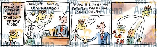 aivari09008 ADÃO ITURRUSGARAI, MUNDO MONSTRO, 3904, VARIEDADES, FOLHA DE SÃO PAULO, 19.06.2009.DiálogoPrimeiro e último dia de trabalho de José Pedro...- Parabéns! Você foi contratado!- Êêêê!!!- Amanhã traga uma foto 3x4 para a sua identificação!- Ok!