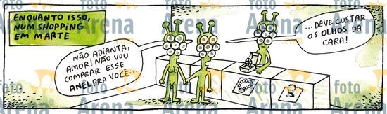 aivari09011 ADÃO ITURRUSGARAI, MUNDO MONSTRO, 3912, VARIEDADES, FOLHA DE SÃO PAULO, 29.06.2009.DiálogoEnquanto isso, num shopping em Marte.- Não adianta, amor! Não vou comprar esse anel pra você... Deve custar os olhos da cara.