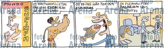 aivari09013 ADÃO ITURRUSGARAI, MUNDO MONSTRO, 3916, VARIEDADES, FOLHA DE SÃO PAULO, 02.07.2009.DiálogoMundo supimpa.Os halterofilistas fariam exercício só de um lado.Os peixes não teriam espinhas.Os psicanalistas pagariam seus pacientes.
