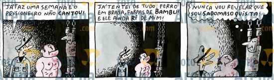 aivari09020 ADÃO ITURRUSGARAI, MUNDO MONSTRO, 3937, VARIEDADES, FOLHA DE SÃO PAULO, 28.07.2009.Diálogo- Já faz uma semana e o prisioneiro não cantou!- Já tentei de tudo: ferro em brasa, farpas de bambu! E ele ainda ri de mim!- Nunca vou revelar que sou sadomasoquista!