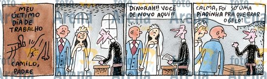 aivari09021 ADÃO ITURRUSGARAI, MUNDO MONSTRO, 3938, VARIEDADES, FOLHA DE SÃO PAULO, 29.07.2009.DiálogoMeu último dia de trabalho. Camilo, Padre.- Dinorah!! Você de novo aqui!! Calma, foi só uma piadinha pra quebrar o gelo!