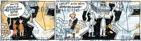 aivari09023 ADÃO ITURRUSGARAI, MUNDO MONSTRO, 3940, VARIEDADES, FOLHA DE SÃO PAULO, 31.07.2009.Diálogo- Muito louca arquitetura desta cidade!- Louca?! Acho bem normalzinha!