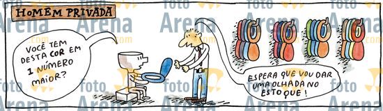 aivari09028 ADÃO ITURRUSGARAI, MUNDO MONSTRO, 3950, VARIEDADES, FOLHA DE SÃO PAULO, 13.08.2009.DiálogoHomem Privada.- Você tem desta cor em 1 número maior?- Espera que vou dar uma olhada no estoque!
