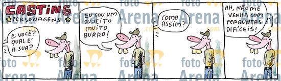 aivari09031 ADÃO ITURRUSGARAI, MUNDO MONSTRO, 3956, VARIEDADES, FOLHA DE SÃO PAULO, 20.08.2009.DiálogoCasting personagens.- E você? Qual é a sua?- Eu sou um sujeito muito burro!- Como assim?- Ah, não me venha com perguntas difíceis!