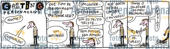 aivari09032 ADÃO ITURRUSGARAI, MUNDO MONSTRO, 3961, VARIEDADES, FOLHA DE SÃO PAULO, 26.08.2009.DiálogoCasting personagens.- Nome?- Clodoaldo!- Que tipo de personagem você pretende ser?- Um anti herói... Um looser, um predador, um sujeito triste, sem amigos, sem amor! Que gosta de dias cinzas e chuvosos!- Toma o telefone do meu psicanalista!- Pô, valeu!- Próximo!