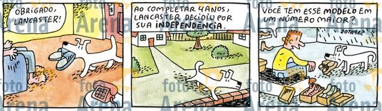 aivari09034 ADÃO ITURRUSGARAI, MUNDO MONSTRO, 3969, VARIEDADES, FOLHA DE SÃO PAULO, 04.09.2009.Diálogo- Obrigado, Lancaster!Ao completar 4 anos, Lancaster decidiu por sua independência.- Você tem esse modelo em um número maior?