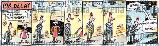 aivari09037 ADÃO ITURRUSGARAI, MUNDO MONSTRO, 3973, VARIEDADES, FOLHA DE SÃO PAULO, 09.09.2009.DiálogoMister Delay.- O senhor tem horas?- Tenho! Meia noite e quinze!